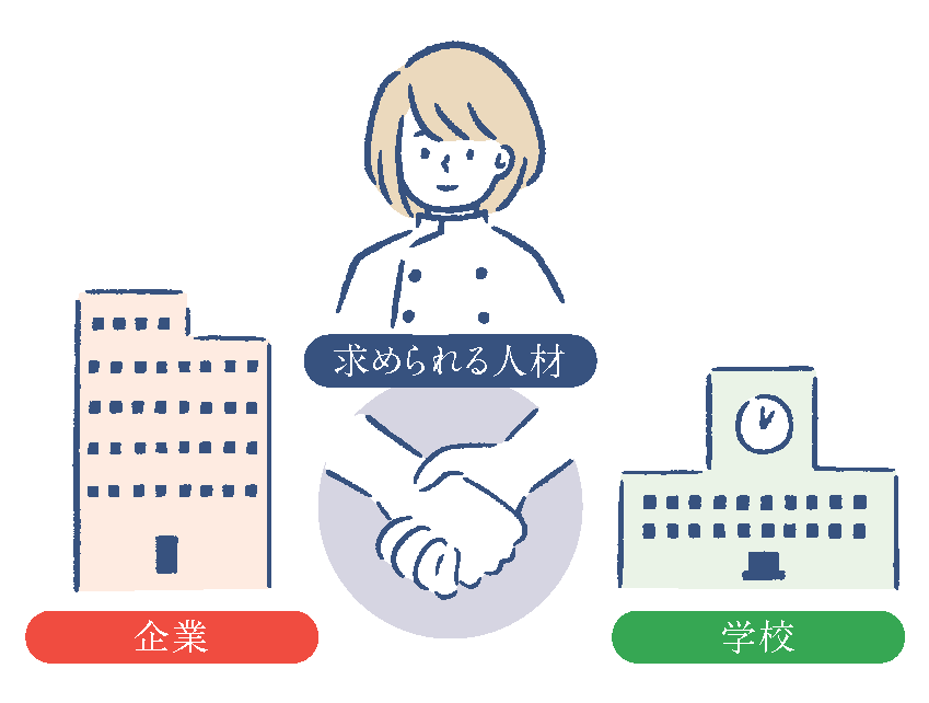 カリキュラム編成に企業が加わって検討し、業界の現状や業界からの教育に対する要望を把握し、実践的なカリキュラムを作成します。