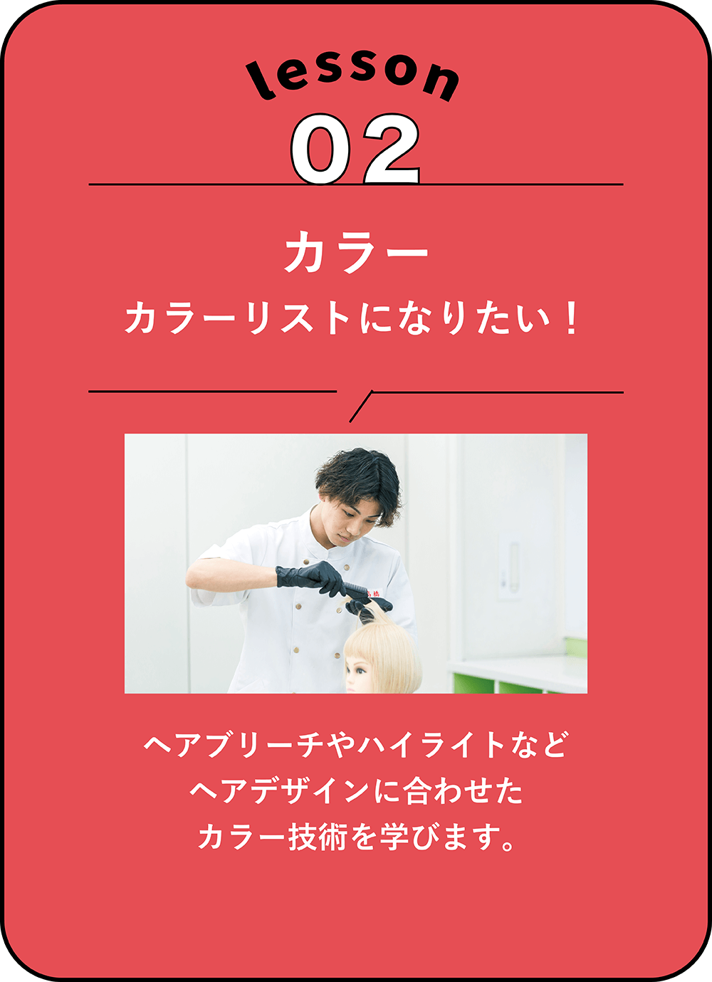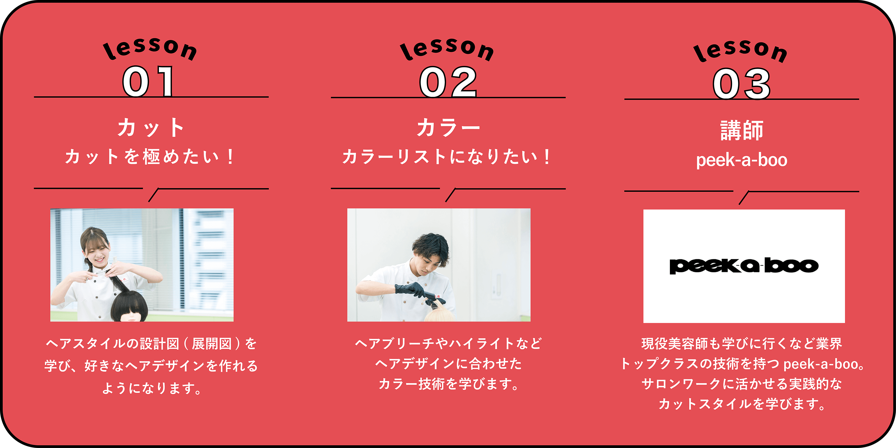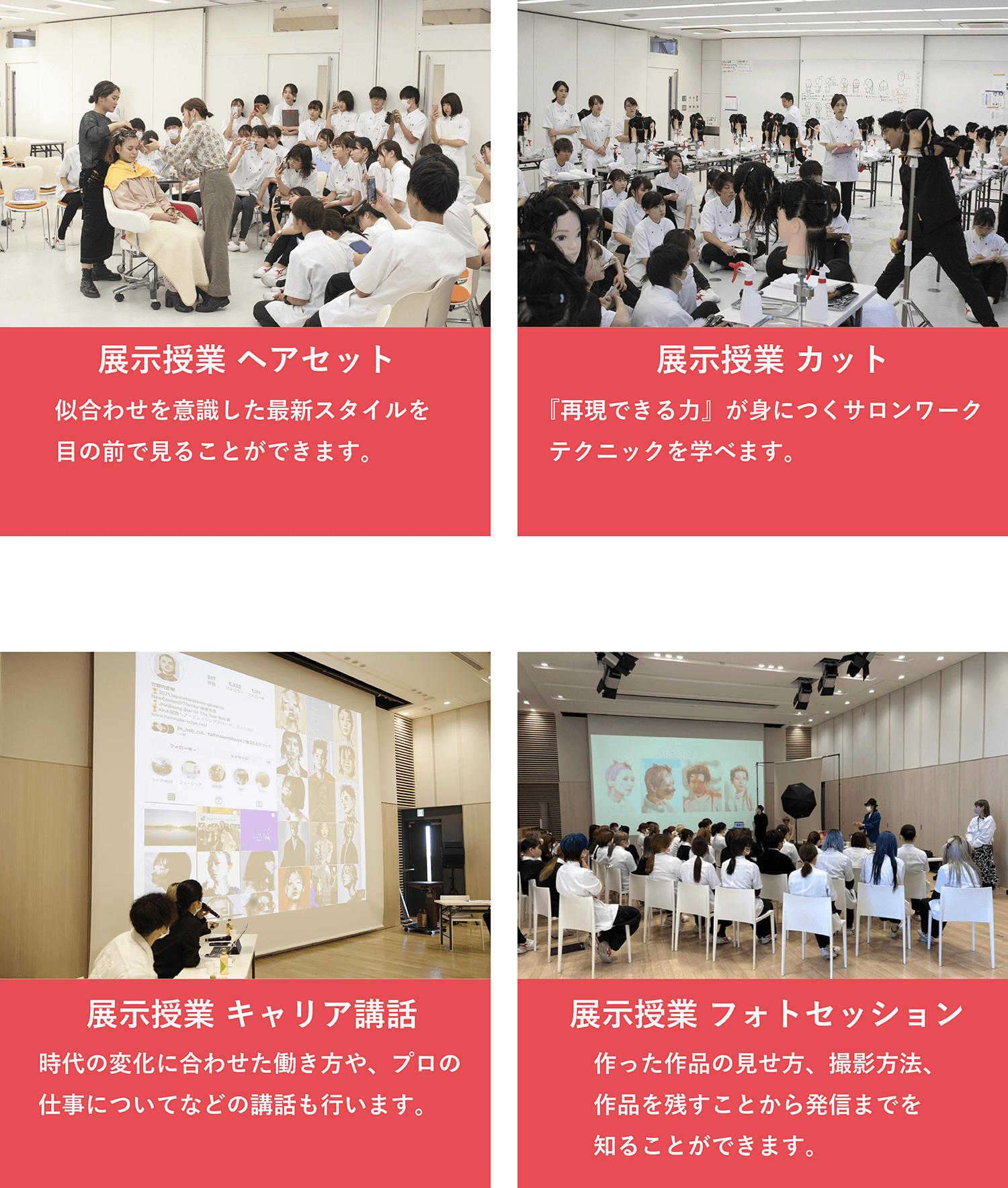 カット/シャンプー/ヘアカラーリング/パーマ/マッサージ/ヘアセット/メイクアップ/ネイル/ヘアケアマイスター/毛髪科学/香粧品実験/色彩学/デッサン/造形学/ファッション/広告宣伝/店舗設計/ビジネスマインド® /国家試験課題/実務実習
