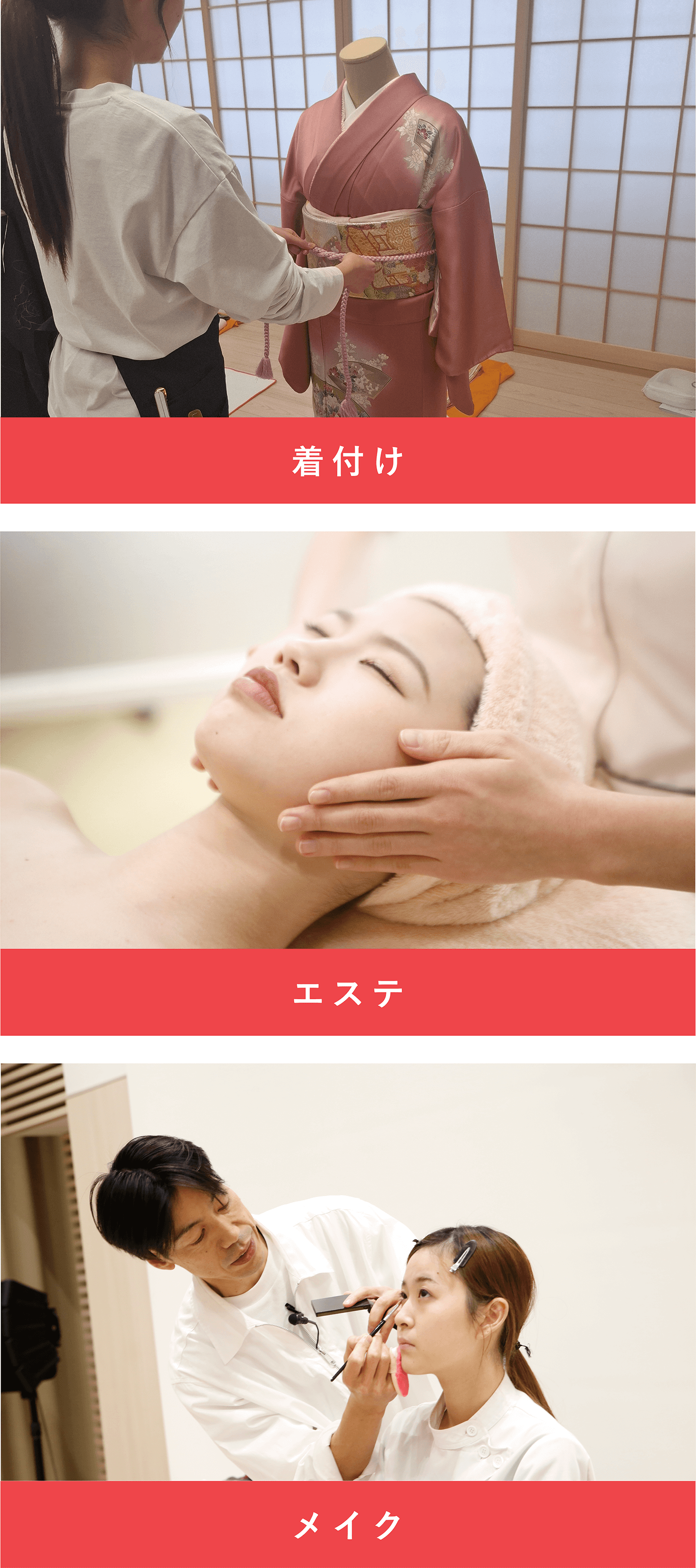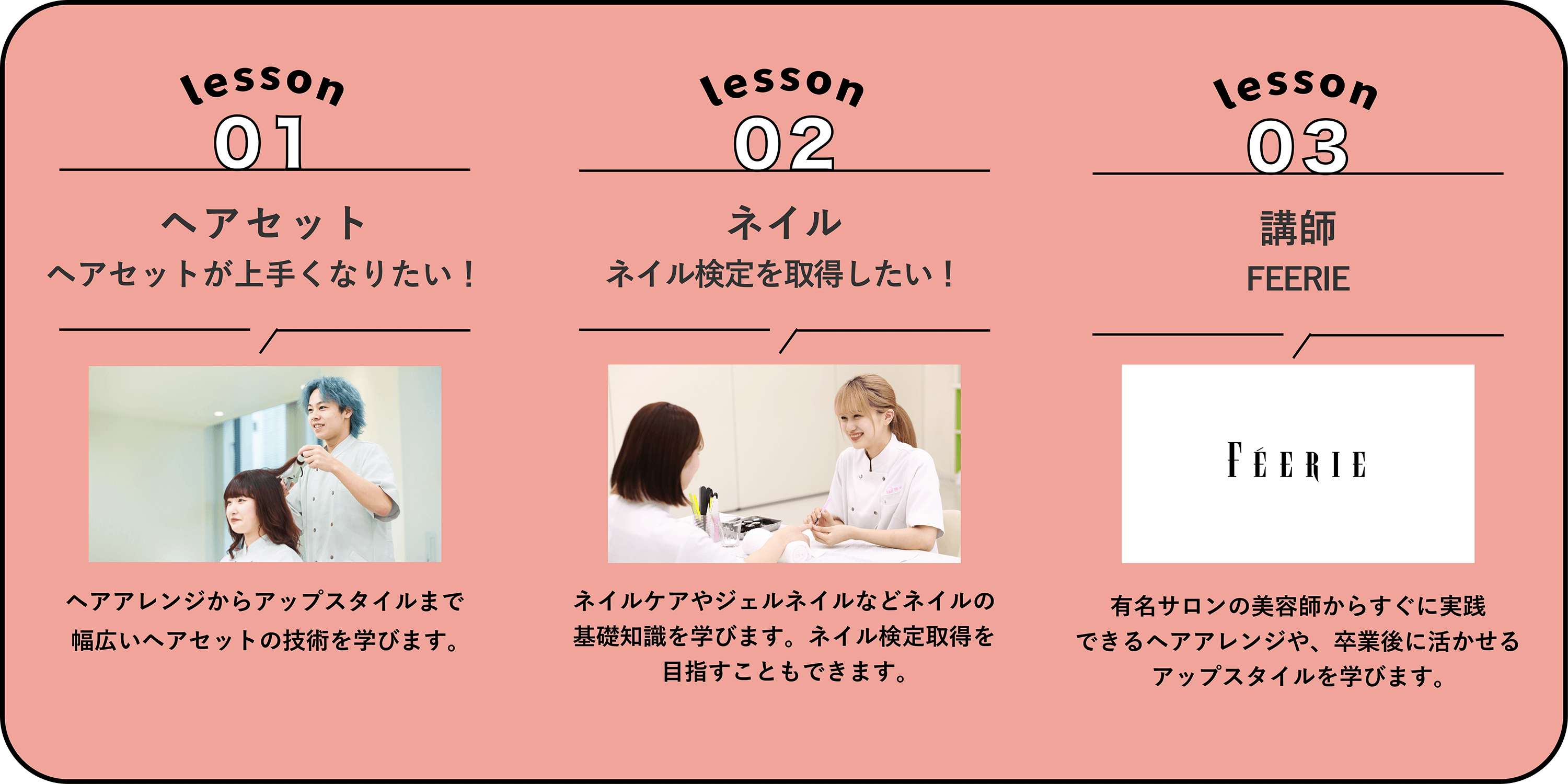 多様化する美容業界を視野に入れ、自身のキャリアデザインをできるように取り揃えています。