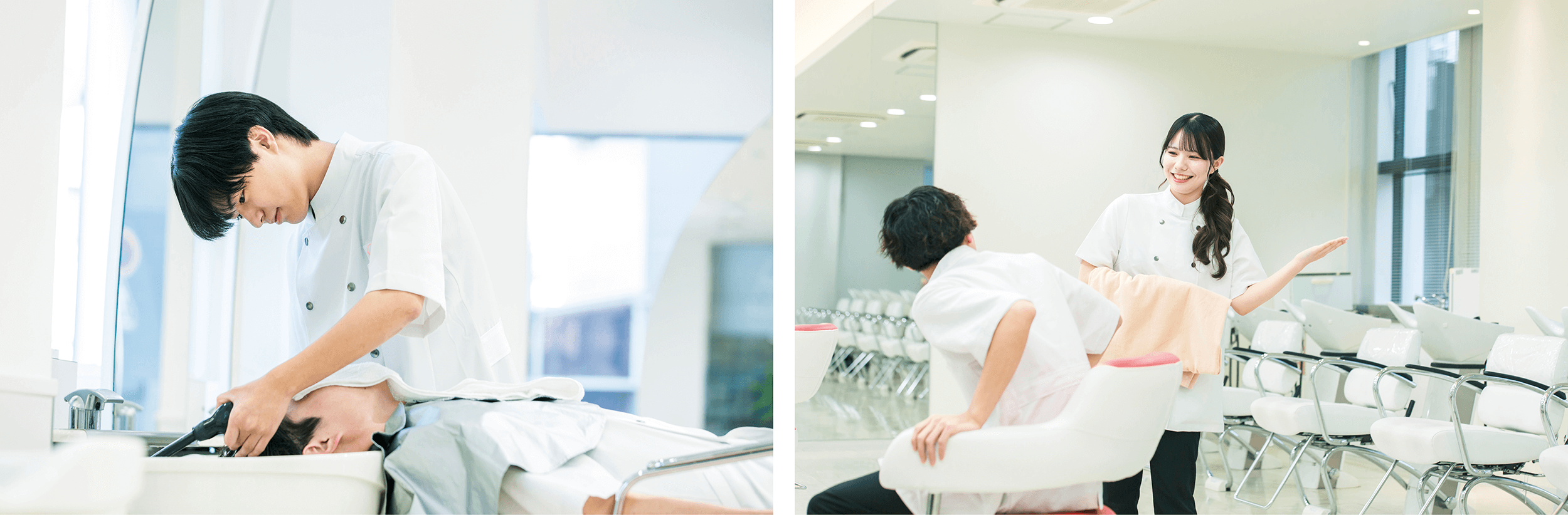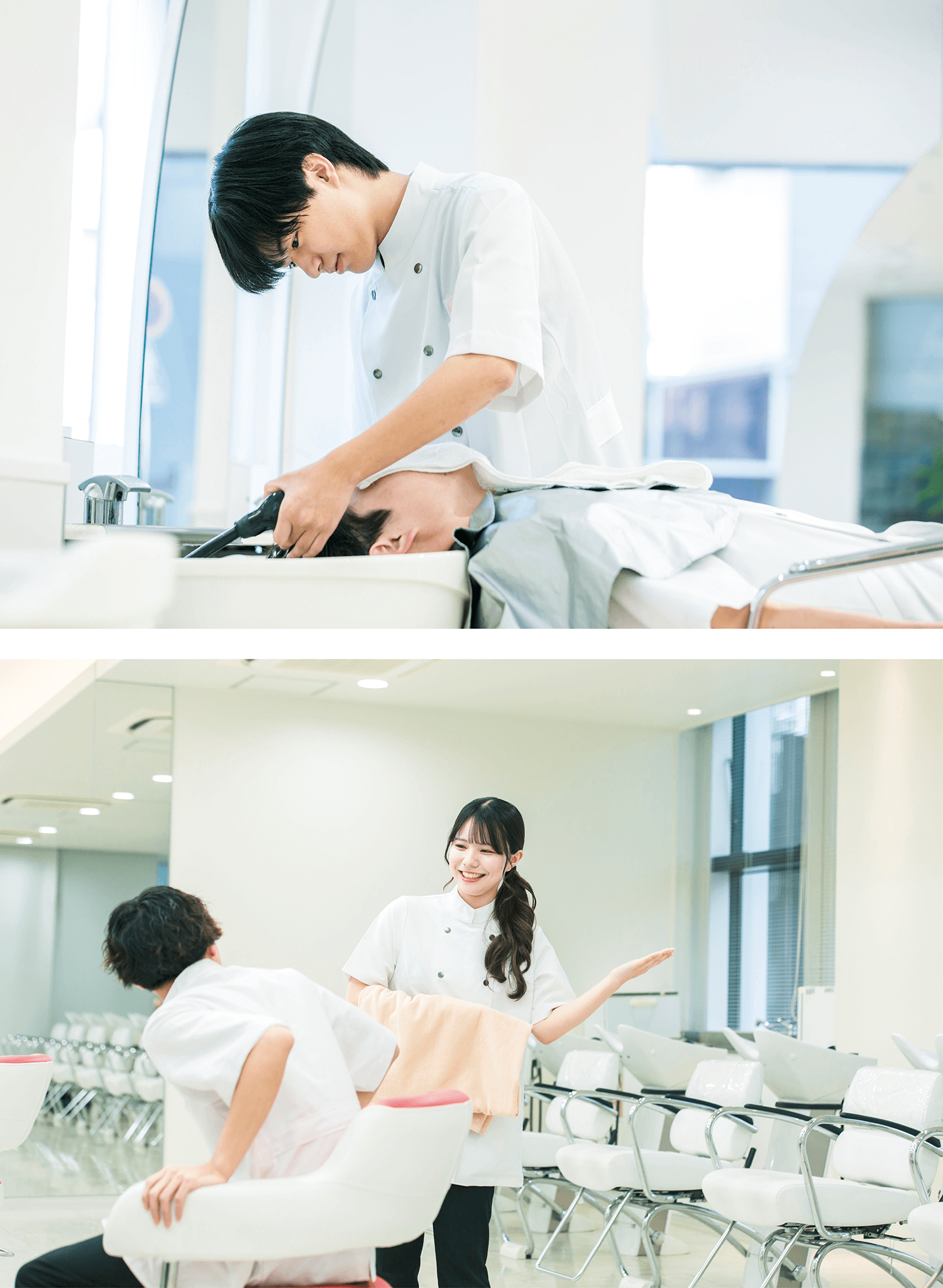 就職後、即戦力として活躍することを目標に掲げ、再度シャンプーとバックシャンプー、両方のシャンプー技術を学びます。また、実務実習においては実際にお客様のシャンプーを担当するなど、授業で習ったことを実践に活かすことができるため、就職後、早期入客デビューを実現できます。