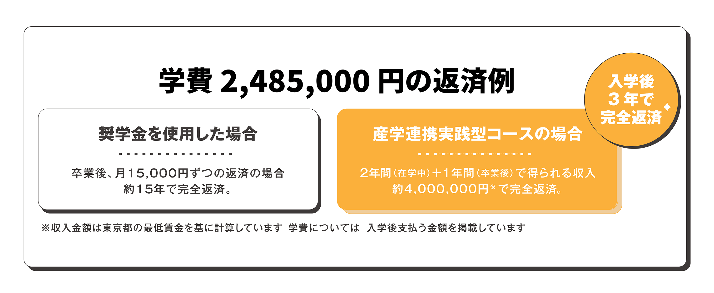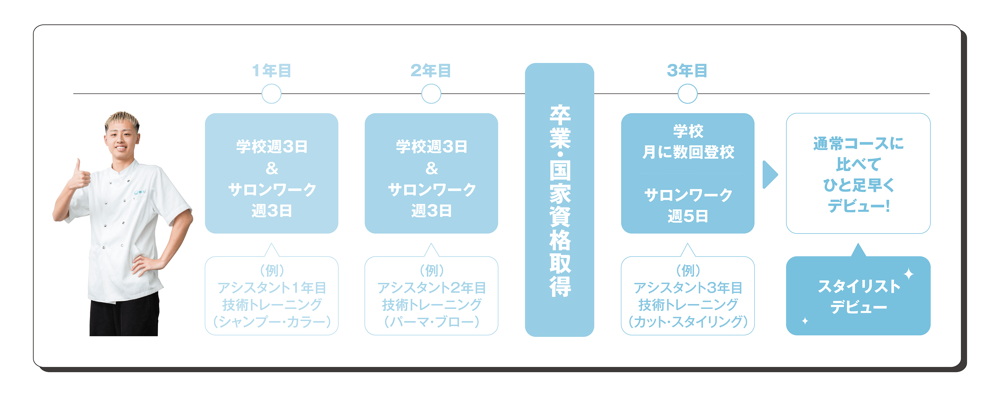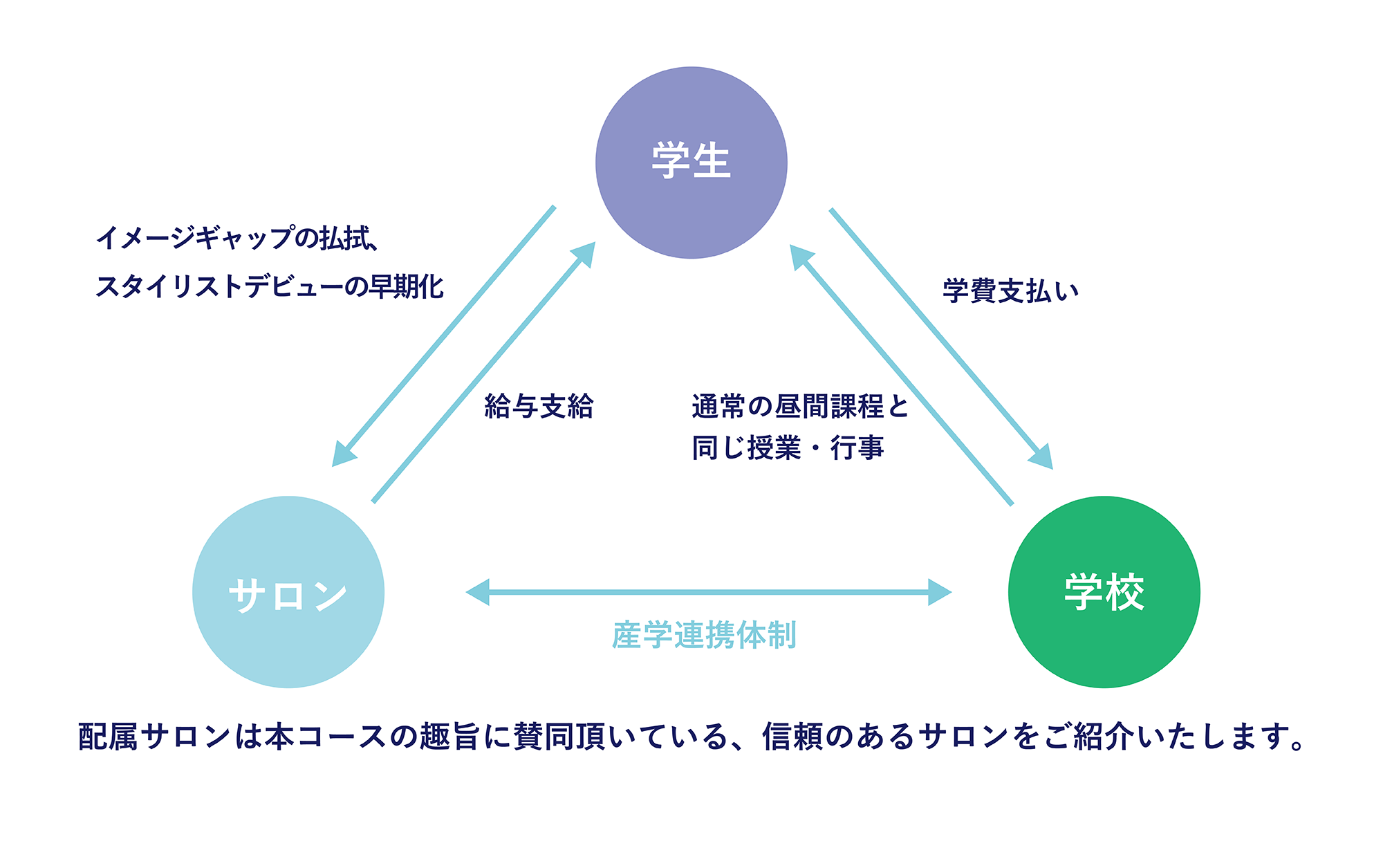 自力進学で スタイリストデビューを 目指す特別コース 産学連携実践型コースは「理容科」の学びを受けながら、学校とサロンワークを両立する学科です。 1週間のうち学校に3日登校、サロンに3日出勤します。働いたお金は学費に充てることができるため保護者の方に負担をかけることなく、自力進学が可能です。 学校と理容室の連携により、より早く・質の高い理容師を目指すことができます。