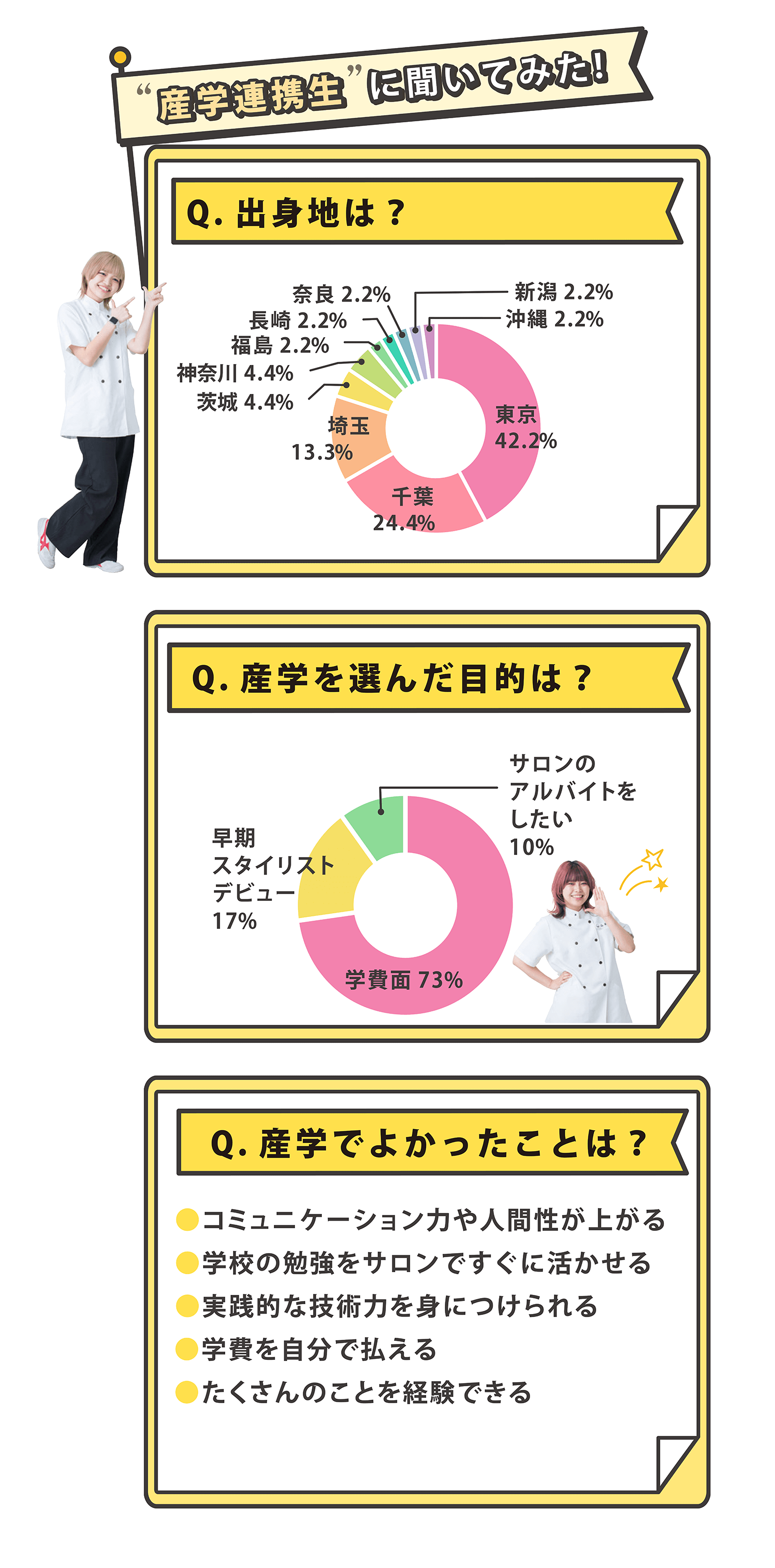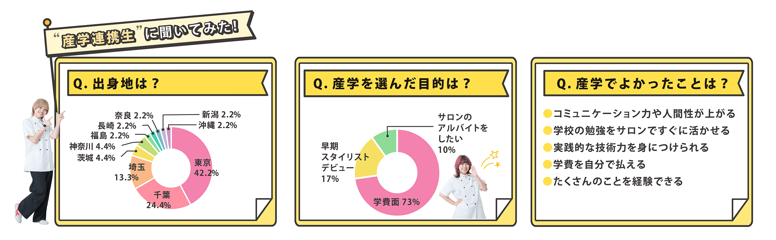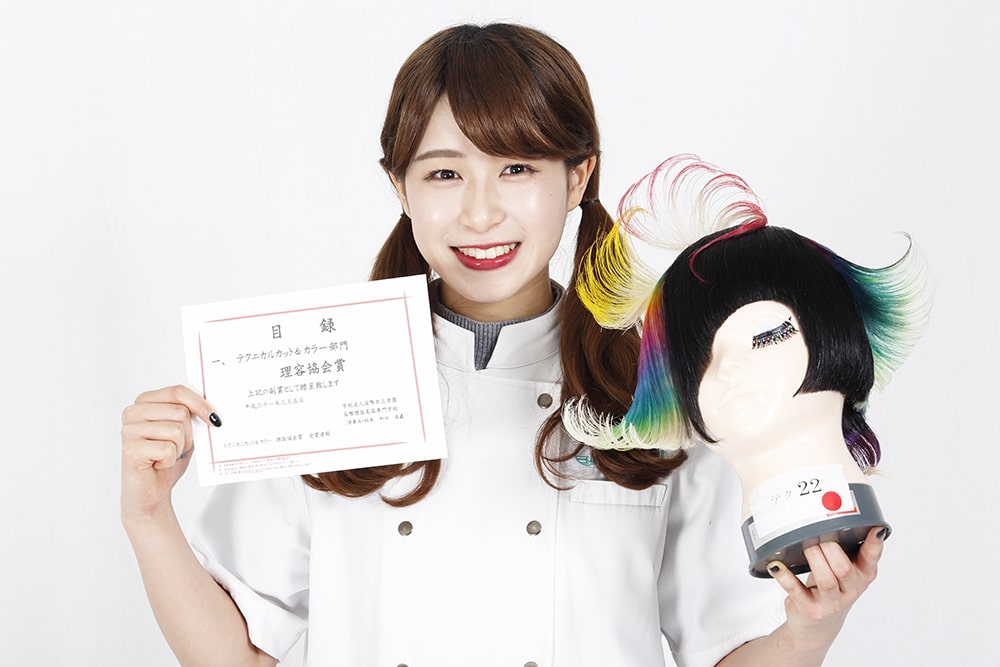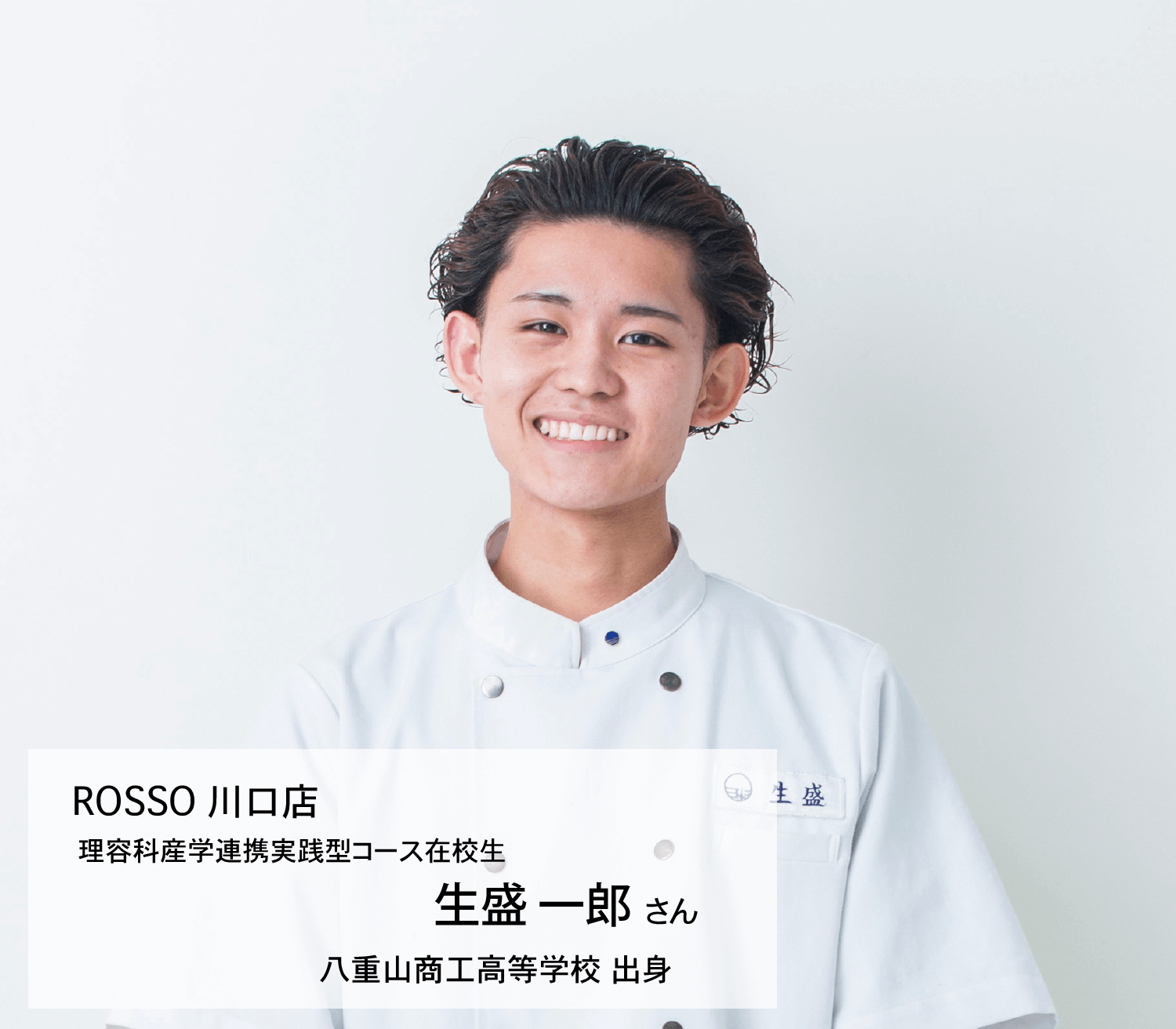 理容科の教育が活きる 学生の声 自力進学をしたいと思いこのコースを選びました。理容科の産学は通常のコースより授業時間が長くなり大変なこともありますが、少人数指導のこともあるので上達が早いと感じています。サロンでは空き時間に練習などをしているので一人前になれるように頑張りたいです。 学校の勉強と並行して実践的な技術を学ぶことができると思い、このコースを選択しました。サロンワークはスタッフの技術を間近で見ることもできるので、知らないことをたくさん吸収できとても勉強になります。また、サロンをスムーズに回すために自分の立ち居振る舞いも常に考えなければいけないので、判断力も身についていると感じます。