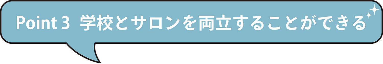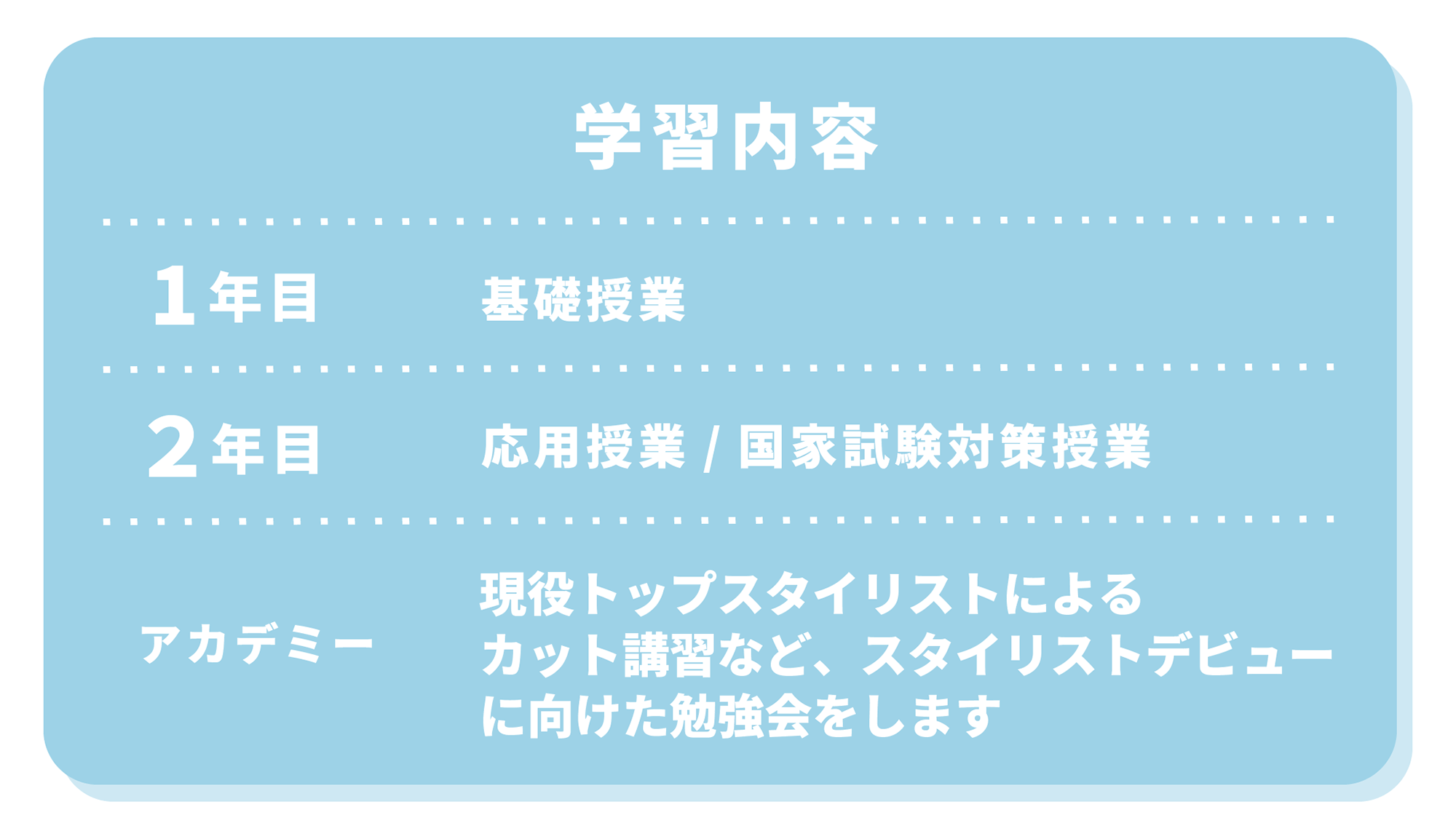 いち早く学べる 産学連携だからできること 授業と現場のつながりを感じることができます。 また、アシスタント業務を早い段階からスタートするため、早期スタイリストデビューを実現できます。 サロンで働いたお金を学費に充てることができるため、保護者の方に負担をかけることなく、自力進学が可能になります。 また、遠方からの進学の場合、寮を完備しているサロンをご紹介することもできます。 様々な取り組み サロンワーク 週3日のサロンワークをおこないます。現場で接客や技術をいち早く学ぶことができます。 学校行事 学校行事にもすべて参加します。学生時代の今しかできない多くの経験を積んでいきます。 豊富な技術と知識 国家資格取得のため、学内の授業では基礎からしっかりと学習していきます。