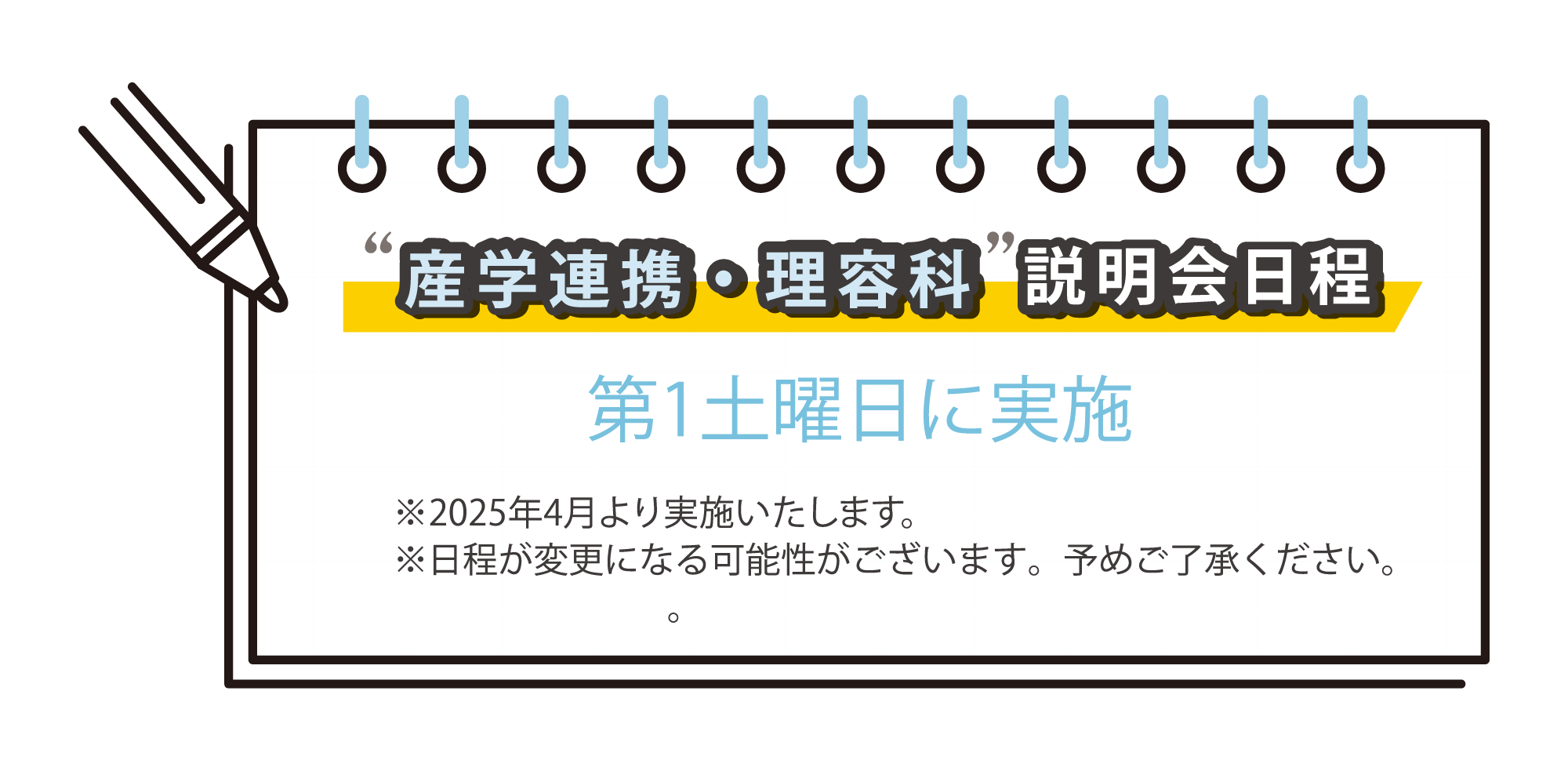 理容科産学連携実践型コースに入学希望の方は、 理容科の体験入学に参加し、「産学連携実践型コース」の説明を聞くことが必須条件 となります。 理容科産学連携実践型コース説明会の開催日程は、下記のイベントページよりお申し込みください。