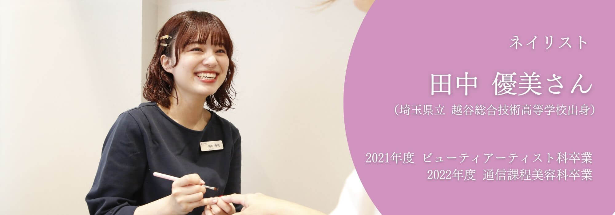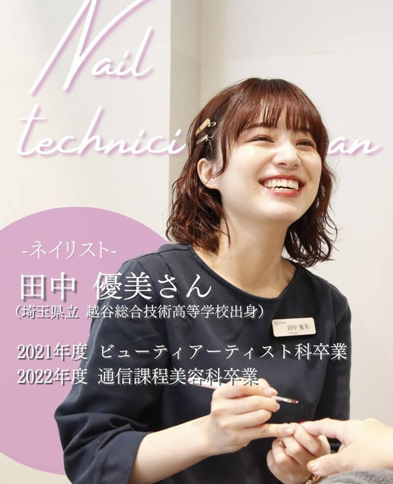 在学中の学外実習の経験がとても活かされています。私はヘアメイク現場での経験を通して”時間”の大切さを学びました。ヘアメイク現場は要望を的確かつ時間内に仕上げることが大切ですが、ネイリストも同じようにお客様の爪の長さ・形・デザインを時間通りに仕上げなければなりません。学外実習ではそういったプロの動き方を社会人になる前に身につけることができたのでよかったです。