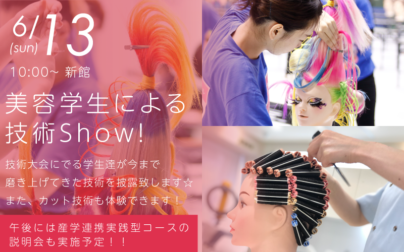 技術大会に出場する、学生達が技術を披露♪ 奇抜なカラーが映えるヘアセットや正確に素早く巻いていくワインディングなど、 美容学生の実力を是非、その目でご覧ください。 デモンストレーションの後にはカット体験も実施予定♪ 午後には産学連携実践型コースの説明もございますので、気になる方はそちらもご参加ください♪ 新型コロナウイルス等感染防止に配慮し、下記のような点を徹底し実施を行います。 ・来校いただく際はマスクの着用をお願い致します。 ・参加日当日、発熱がある場合は、参加をお控えいただくなどご協力お願い致します。 ・全ての会場で人と人との間隔を大きくとり、徹底した換気状況で実施致します。 ・各フロアでの消毒液の設置、こまめな衛生処置を行います。 |