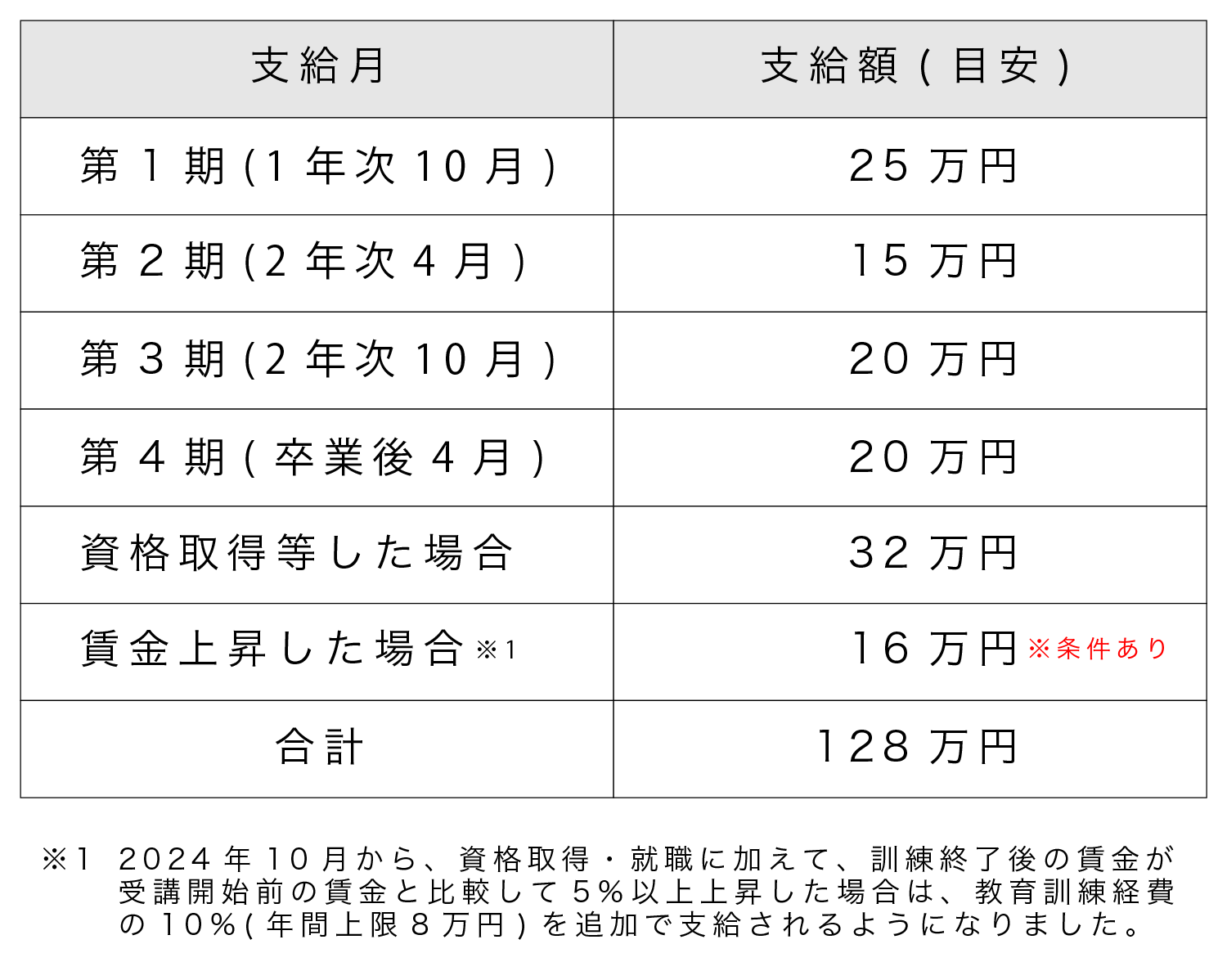 受給対象の場合、教育訓練経費(入学金や授業料など)の50%(年間上限40万円/最大2年間で80万円)の給付を受けることができます。受講修了から1年以内に資格取得等をして雇用保険の一般被保険者として雇用されると、教育訓練諸経費の20%(16万円×2年間分=32万円)が追加支給されます。在学中と卒業後の合計支給額は最大112万円です!