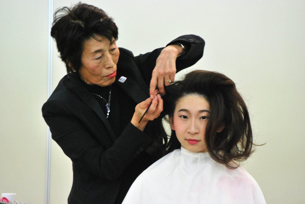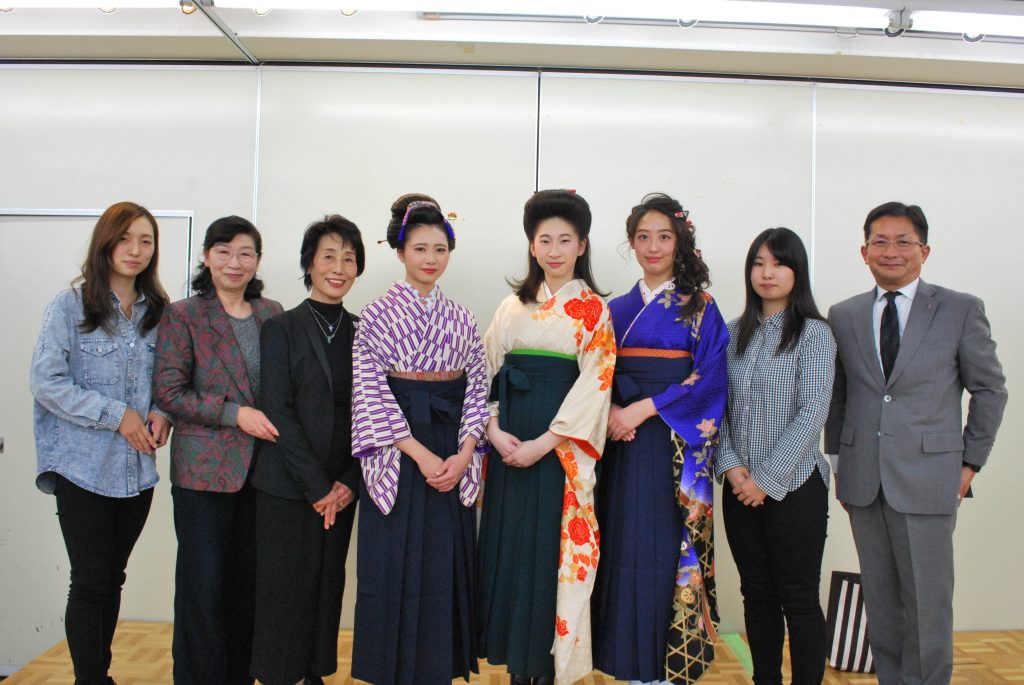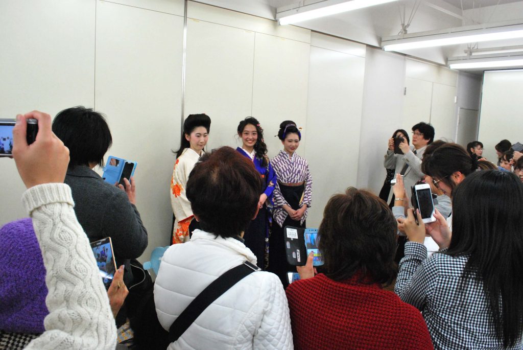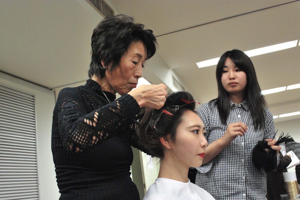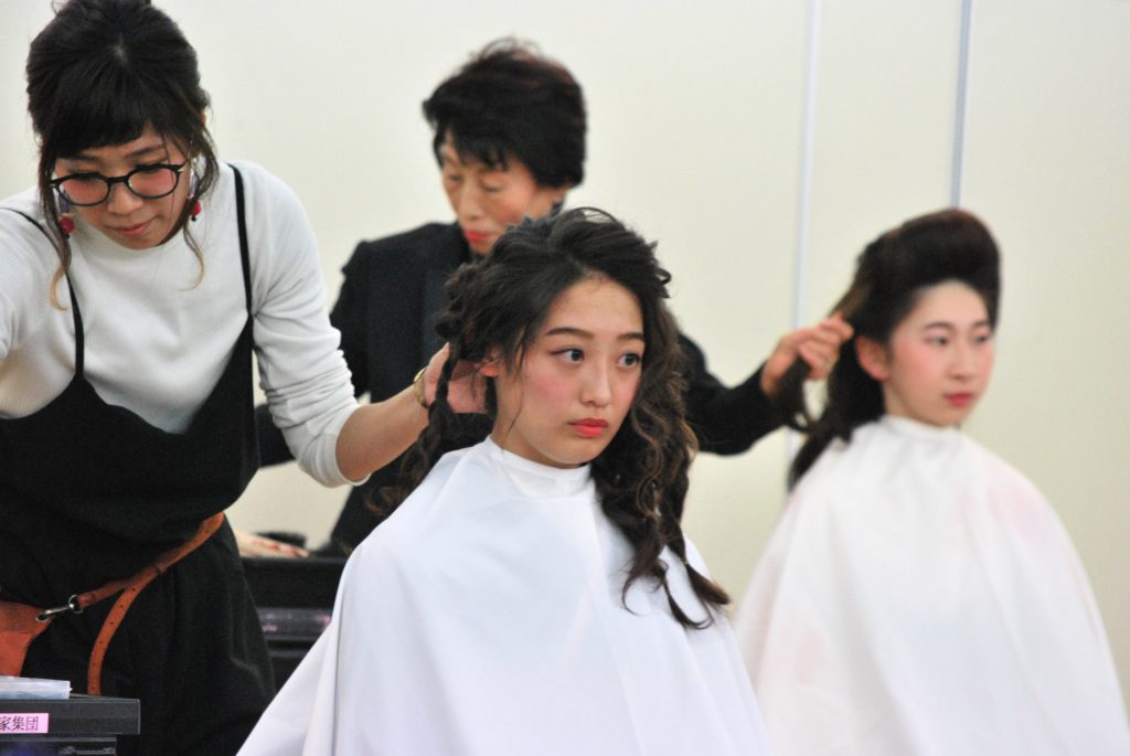 先日、産学連携活動の一つとして代々木にある美容会館にてBA東京(東京都美容生活衛生同業組合)のファッションショーに本校学生がモデル及び見学として5名(美容科、ビジネス美容科[エステの学科])参加致しました。テーマは卒業式の女性を、大正、昭和、現在それぞれのヘア・メイク・着付で表現するといったものでした。学生をプロの手で美しく華麗に仕上げてもらいました。モデルとして参加した学生は、ベテランの先生方にヘアセットや着付けをしてもらうことで、普段の授業とは違うテクニックを肌でしっかりと感じとれたことでしょう。また、今回見学として参加した学生は、ただ見学をするのではなく自ら率先して先生方のお手伝いをしておりました。自分たちができることを精一杯頑張っていることに対して先生方からもお褒めの言葉を頂きました。その姿を見ると普段の学校で教えている躾教育がしっかり学生の身になっていることを感じました。今後もKOKUSAIでは企業との連携を密にして、学生達の成長に繋がる活動を続けていきます。BA東京ファッションショーに関わった全ての皆様へ、このような機会を頂きありがとうございました。