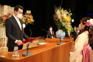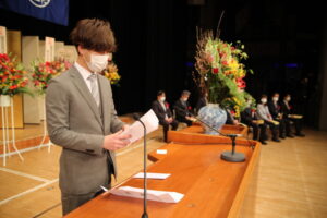 今年度は新型コロナウイルスの影響により、密にならないよう学生・保護者の出入口の分散、消毒の徹底、式を短縮しての実施といたしました。