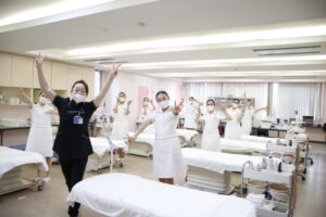 プロのエステティシャンとしての第一歩を踏み出したビジネス美容科の学生たち。
