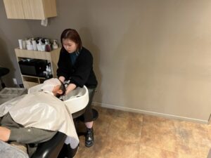 実務実習とは即戦力となる人材育成のためおこなっており、今回はサロンでシャンプーやマッサージ、パーマなどの手伝いができるよう、学生たちは事前に授業内で技術を習得してきました。