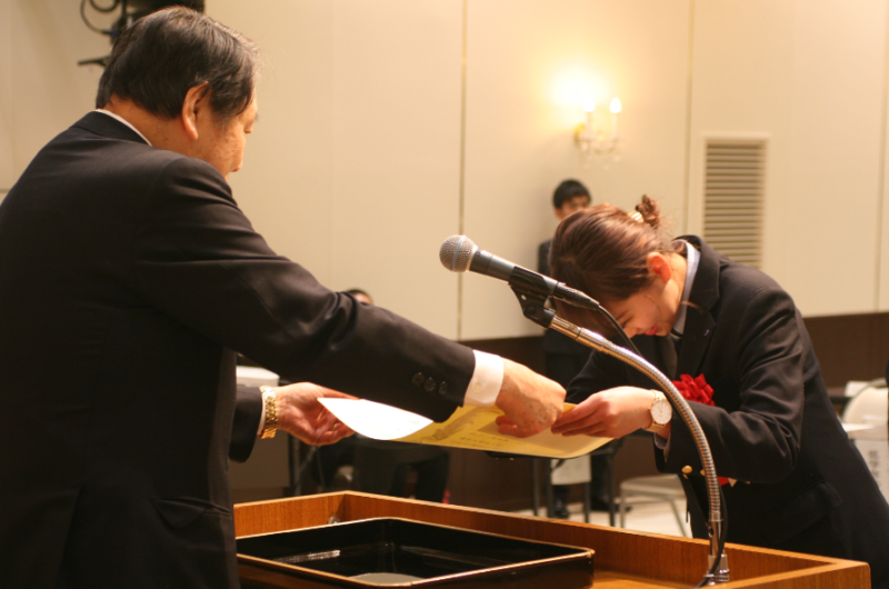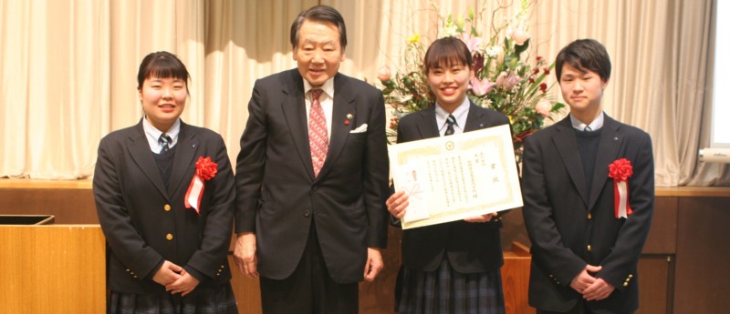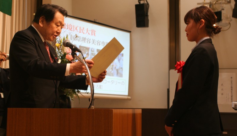 学校代表として美容高等科の生徒3名が授賞式に参加し、荒川区長の西川太一郎先生から賞状とお褒めの言葉をいただきました。