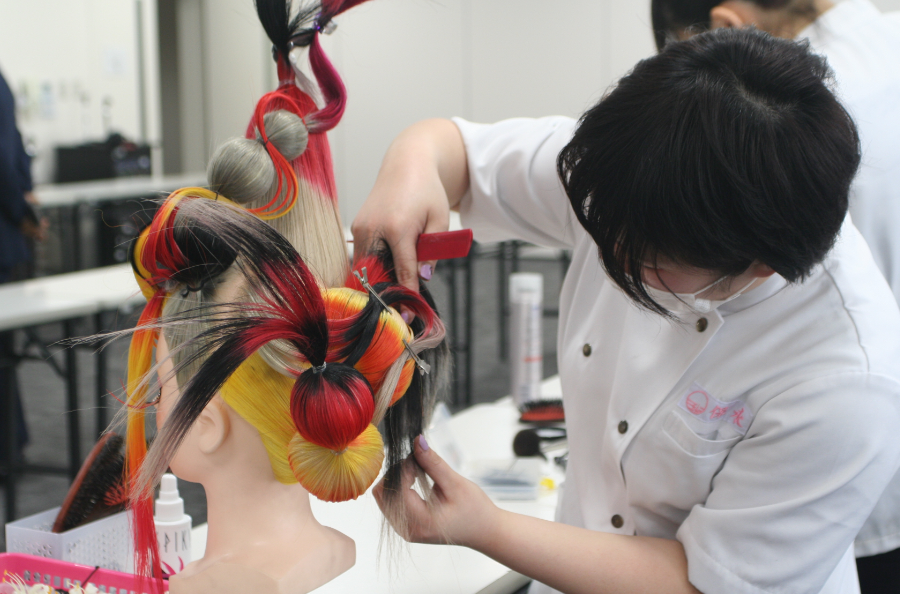本年度のテーマは Peaceful Innovation(平和革新)。学生・生徒はこのテーマに合わせ、各部門に分かれて技を競い合います。部門はカットやメイク、フォトやデッサンなど全部で13部門に分かれています。学年を問わず全員にグランプリ受賞のチャンスがある為、どの学生・生徒も真剣な眼差しで取り組み、会場は熱気で溢れていました。