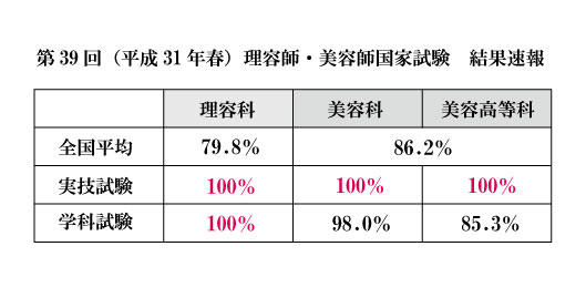 【第39回(平成31年春)理容師・美容師国家試験】合格率報告 2019年3月29日 (使用しない)ブログ お知らせ 3月29日【第39回(平成31年春)理容師・美容師国家試験】の合格発表がございました。本校の結果は以下の情報をご確認ください。