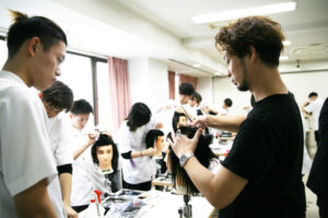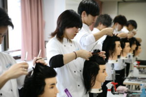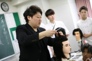 ヘアリゾートクリップスの佐藤秀樹先生に来校していただき、クラシカルカットにする為のベースカットを学びました。ヘアスタイルによって、シザース(はさみ)に入れ方も変わり、学生達も少し戸惑っている様子はありましたが、集中して授業に取り組んでいました。また、リラクゼーションコースではシェービングとエステを組み合わせた「シェステ」を学びます。