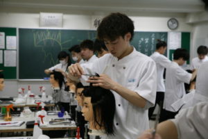 コース選択授業では、2つのコース(スタイリストコース・リラクゼーションコース)に分かれてより専門的な技術を学びます。本日、スタイリストコースはクラシカルカット(美しく調和のとれたスクエアシルエットカットのこと)からスタートしました。