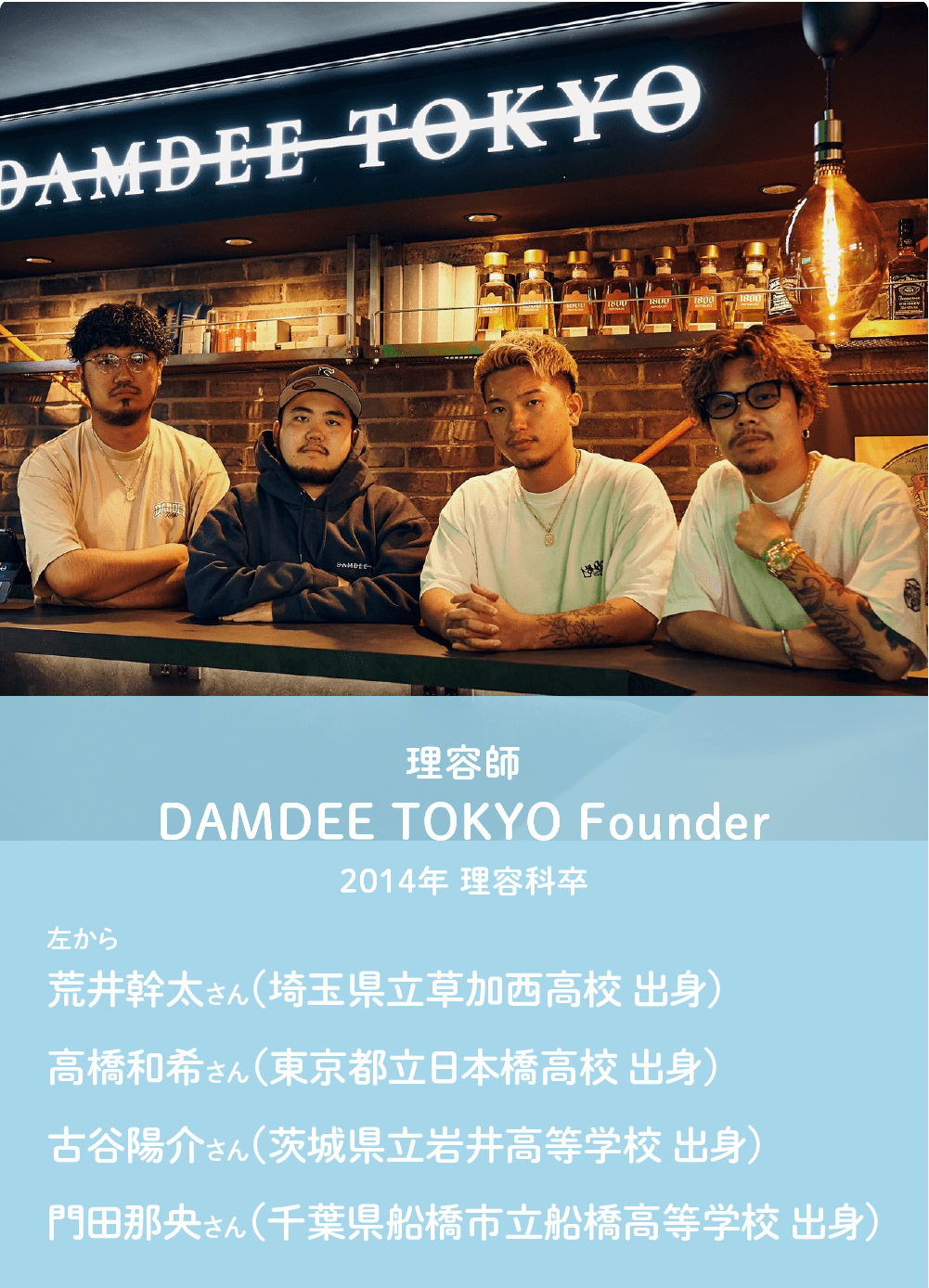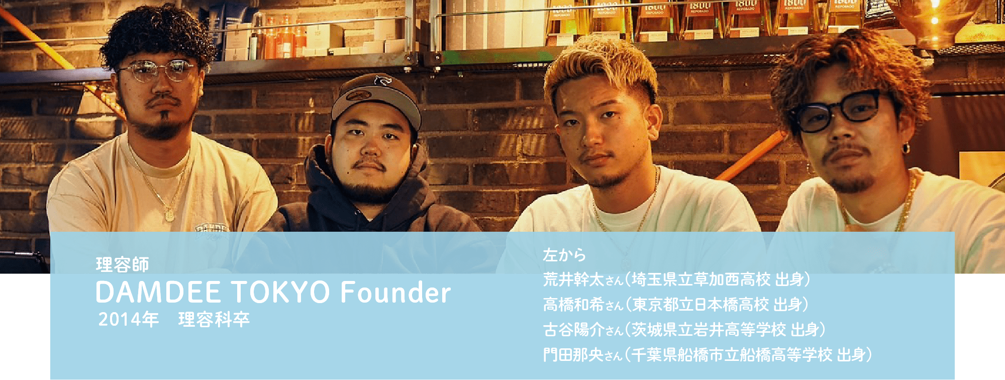 両親と姉が理美容の業界で働いてて、なら自分も…と思い目指し始めました。最初、理容は「床屋さん=おじさんばかり来ている」というイメージで、それが格好いいと思わなかったんです。それでも、髪を切ったりするのは好きで、理容か美容なら自分は男性がメインとなる理容が合っていると思い、続けられるかは分からないけどとりあえず学校に行ってみよう!というきっかけでした。 【門田さん】 高校生の時はやりたい事が明確ではなかったので、逆にやりたくない事を明確にして自分が現実的になれそうな職業を絞っていきました。デザイナーとか、アパレルとか…残った職業を当時の高校の先生と話しながら最終的に理容師に決めました。 なぜ美容ではなく理容にしたかと言うと、当時の高校の先生に、自分が若い時は美容師でもやれるけど、理容師の方が歳をとってもできるよと言われて理容師を選びました。今思えば、自分にとって高校の先生が進路選択のキーパーソンでした。 【古谷さん】 両親が理容師だったからです。小さいころからサロンで両親の仕事を見ていて憧れを感じてこの業界を目指しました。 【荒井さん】 実は、最初は保育士を目指していました。当時はそのコースに入れなくて諦めてしまったんですが、次の夢を探していた時に理容師がお客様の髪形をカッコよくできる良い仕事だなと思い目指しました。 |