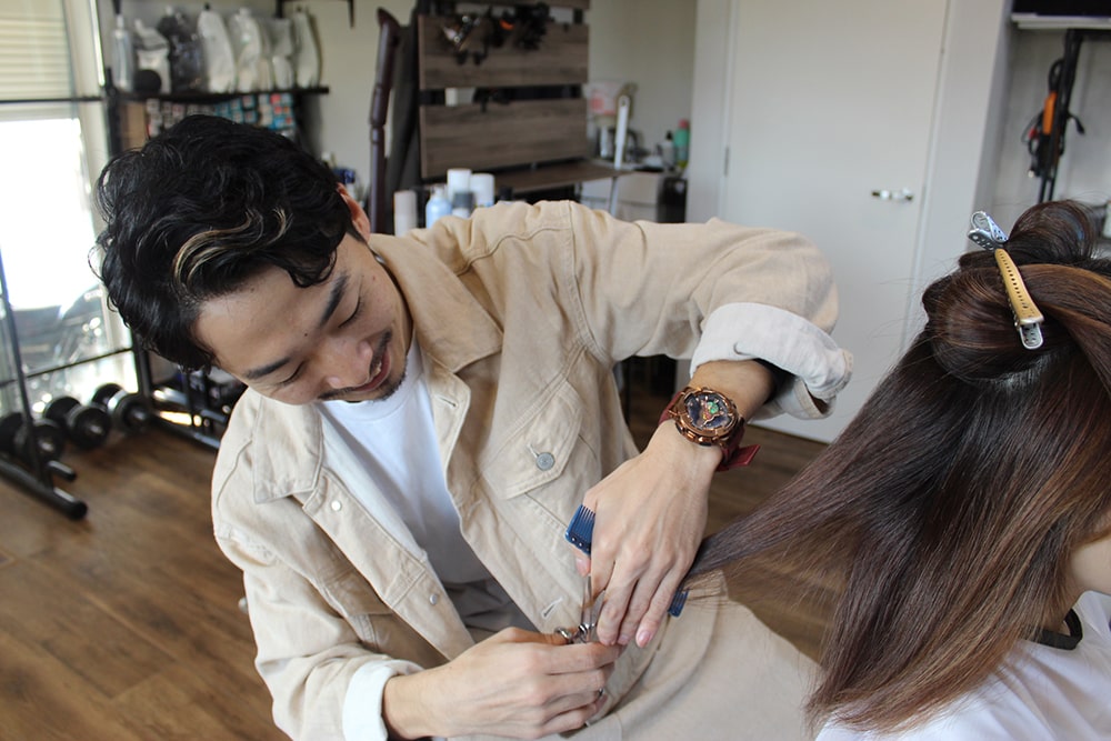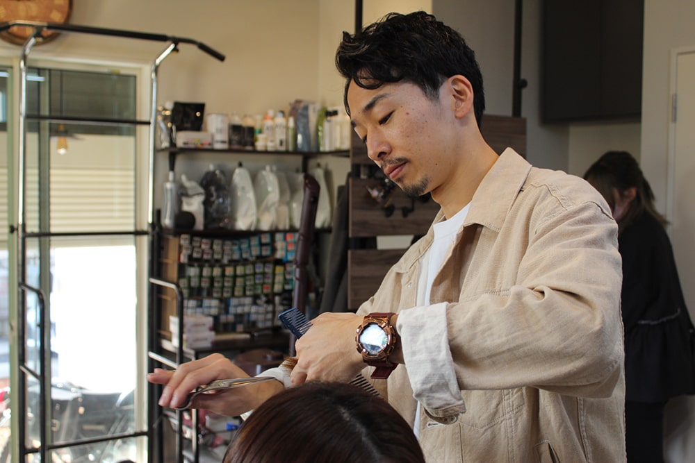 高校生の時に美容室でアルバイトができる求人を見かけたことがきっかけです。元々、調理師か保育士か美容師か何かしらの資格を取って働きたいと思っていた中で、美容室でアルバイトって珍しいなと思い、応募しました。アシスタントとして働き始めると本当に大変なことばかりで、たくさん怒られたりもしましたが、興味のある分野の仕事だったので続けられました。その経験から、パンチパーマなどのメンズのヘアスタイルをつくれるようになりたいと思い、理容の道で専門学校に進学を決めました。
