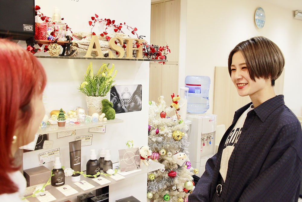 私は1年次の12月にインターンシップで、Ash北千住店に10日間お邪魔させて頂きました。実際不安しかなく、何も分からない所で10日間って絶対ボロボロになる…そう思っていたんです。12月と言うと繁忙期で誰も相手にしてくれないのかなと感じていましたが、全くそうではなく何も分からない私にどんなに忙しくても声を掛けてくださいました。お仕事を振ってくださったり、不安から解消しようと笑わせてくれたり、アドバイスも沢山くれました。忙しい中でスタッフ同士が楽しそうに働いている姿や、スタイリストさんの輝いている姿を見て「ここだ!」となりました。私は人間関係重視でしたので、私にぴったりなサロンを見つけることができてよかったです。